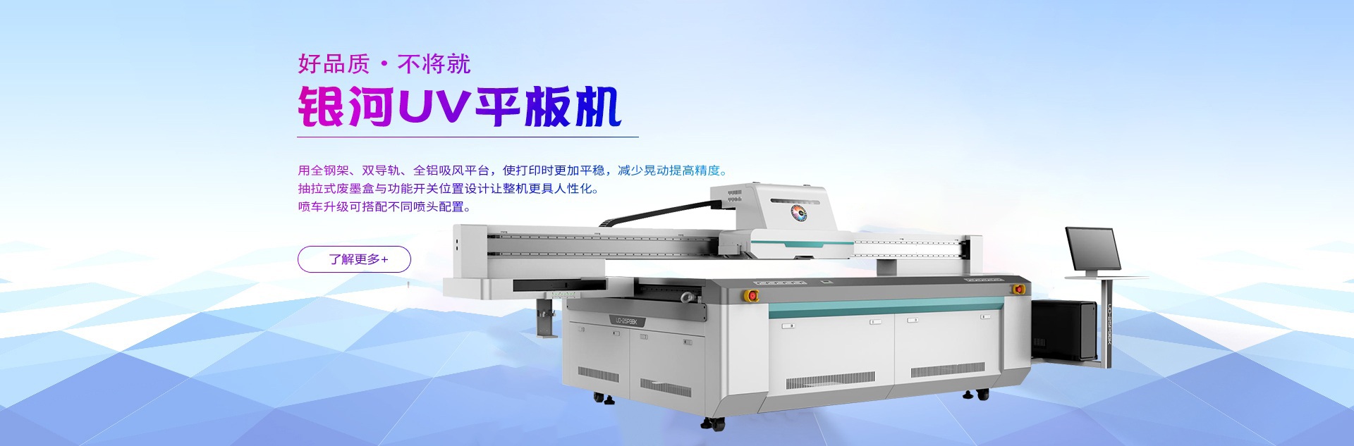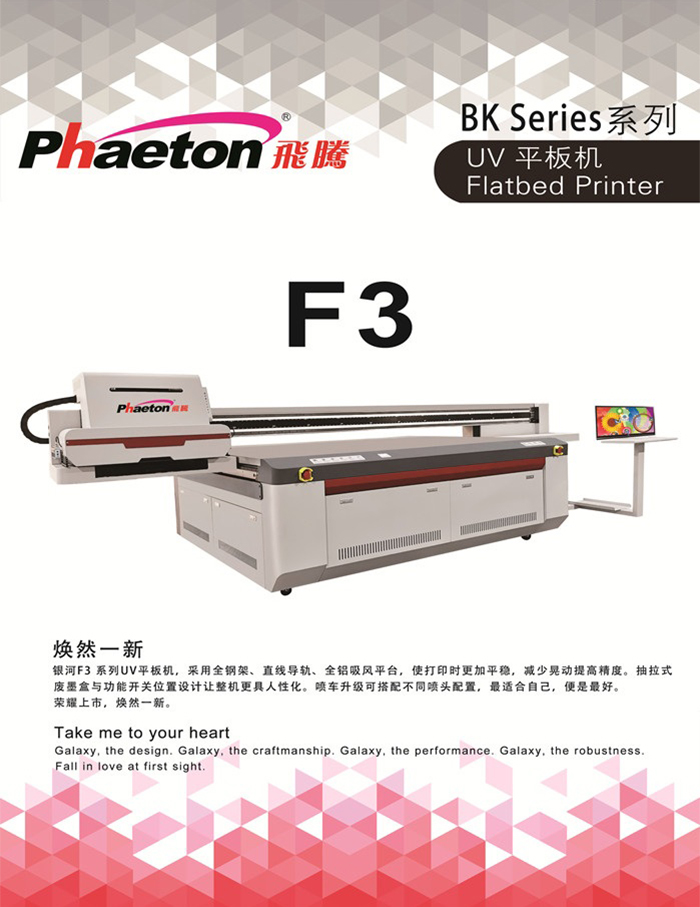 銀河F3系列UV平板機(jī),采用全鋼架、直線導(dǎo)軌、全鋁吸風(fēng)平臺(tái),使打印時(shí)更加平穩(wěn),減少晃動(dòng)提高精度。抽拉式廢墨盒與功能開關(guān)位置設(shè)計(jì)讓整機(jī)更具人性化。噴車升級(jí)可搭配不同噴頭配置,最適合自己,便是最好。 榮耀上市,煥然一新。