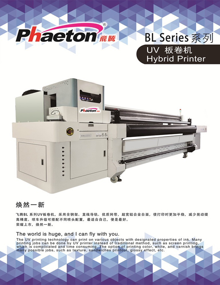 飛騰BL系列UV板卷機(jī),采用全鋼架、直線導(dǎo)軌、優(yōu)質(zhì)網(wǎng)帶,超寬鋁合金臺(tái)面,使打印時(shí)更加平穩(wěn),減少晃動(dòng)提 高精度。噴車升級(jí)可搭配不同噴頭配置,最適合自己,便是最好。 榮耀上市,煥然一新。